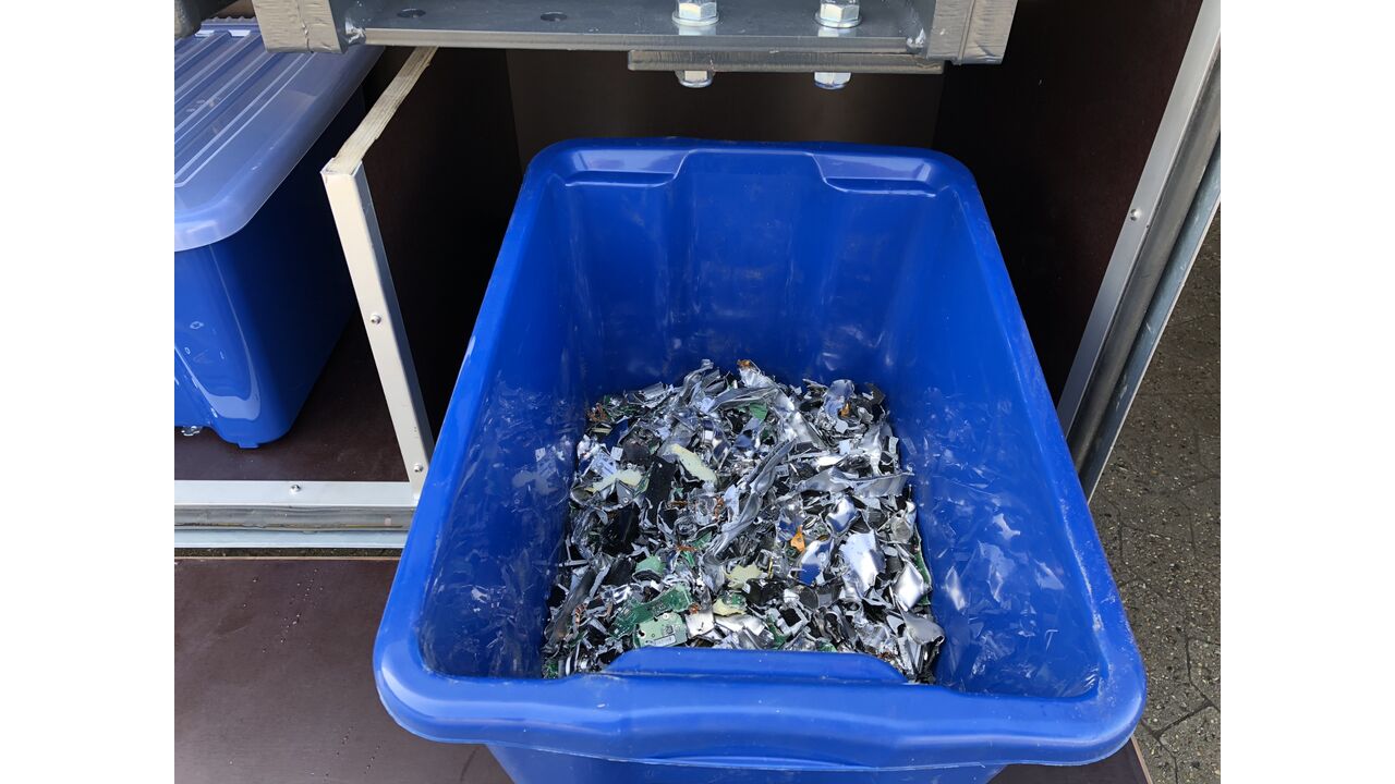 ReTec hat für die mobile Aktenvernichtungsanlage einen kleinen Festplatten Shredder entwickelt, die im Trailer integriert werden kann.